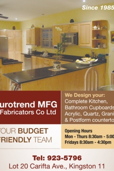 Eurotrend Manufacturing & Fabricators is the pioneer in the home furnishing business with over 25 years’ experience in the industry. Our mission is to be the leading supplier of quality interior furnishings by providing a warm and inviting environment to homes all across Jamaica. We achieve this endeavour through the core values of patience, perseverance and dedication. Our team of professionals are determined to attain perfection from design to finish. Our focus lies in providing elegant yet functional kitchen cabinetry and vanities in order to make your space even more inviting with a luxurious twist.
